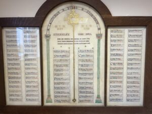 The War Roll is displayed on the wall in Shrawley Village Hall.