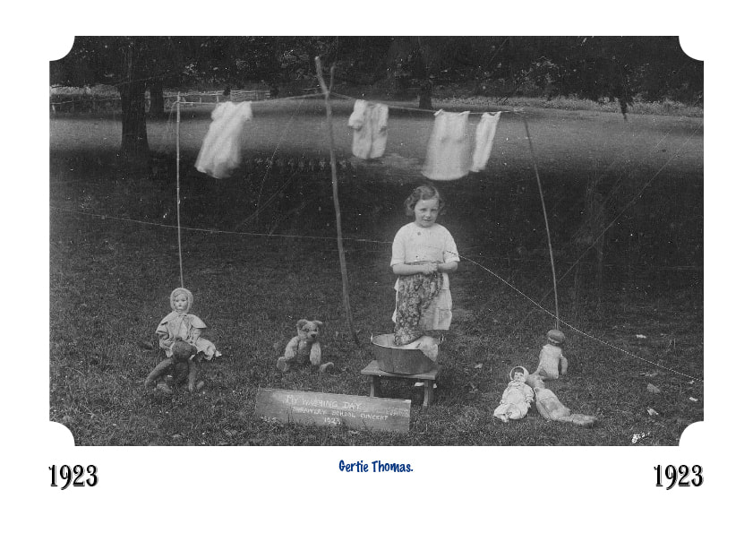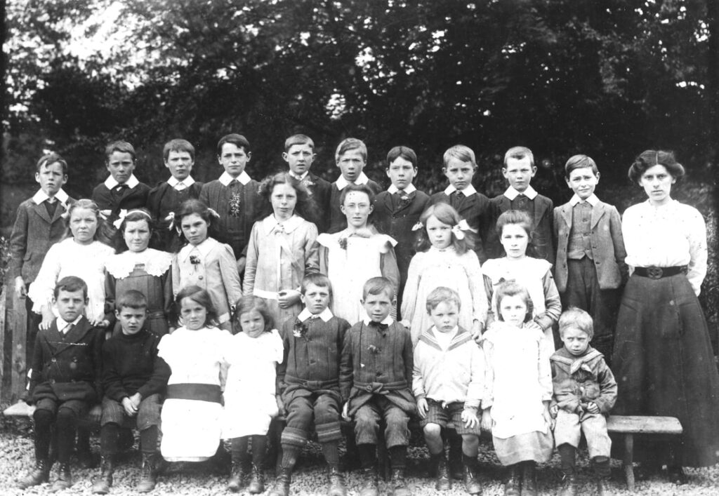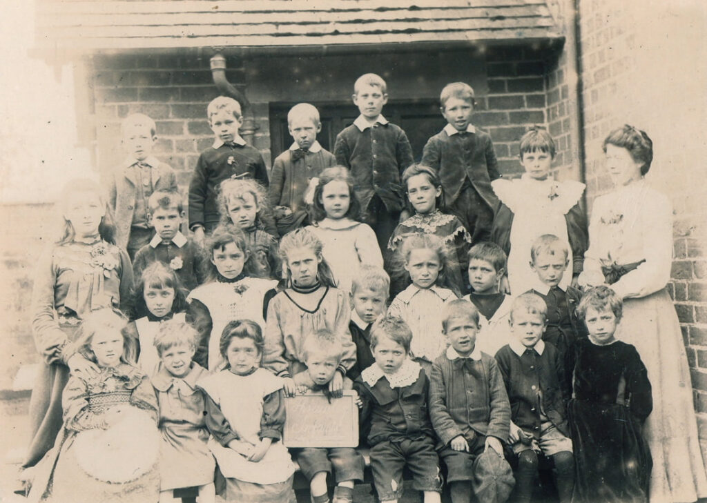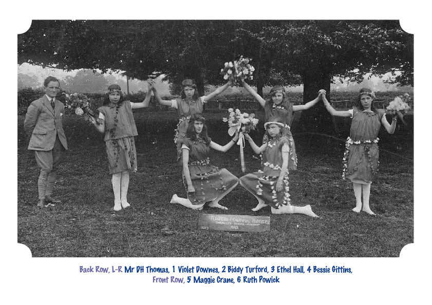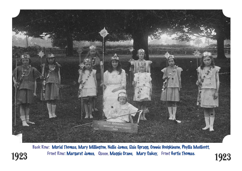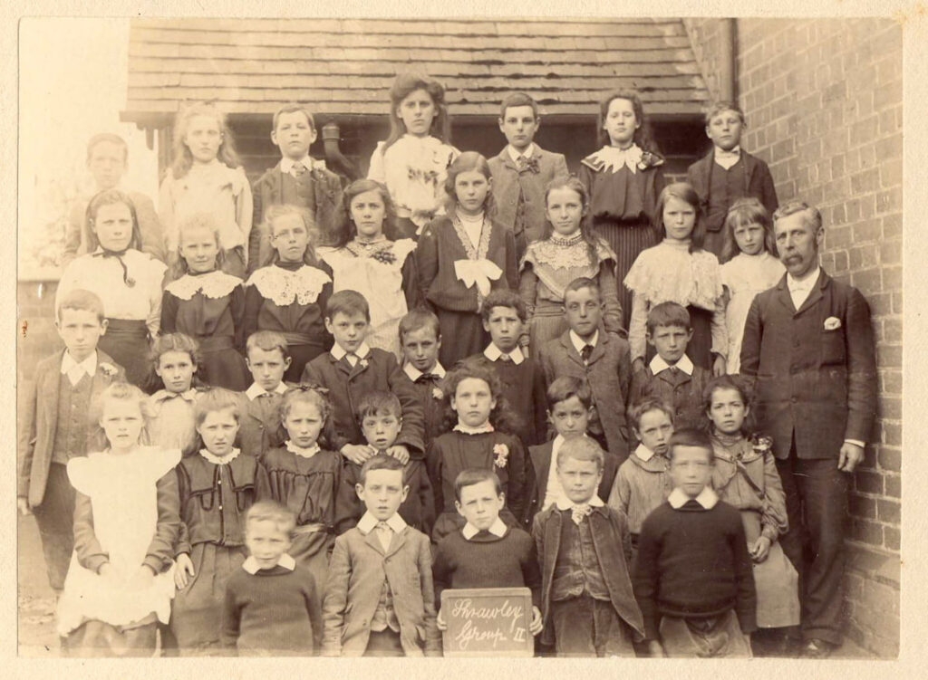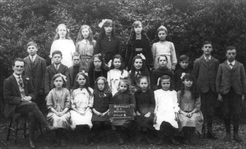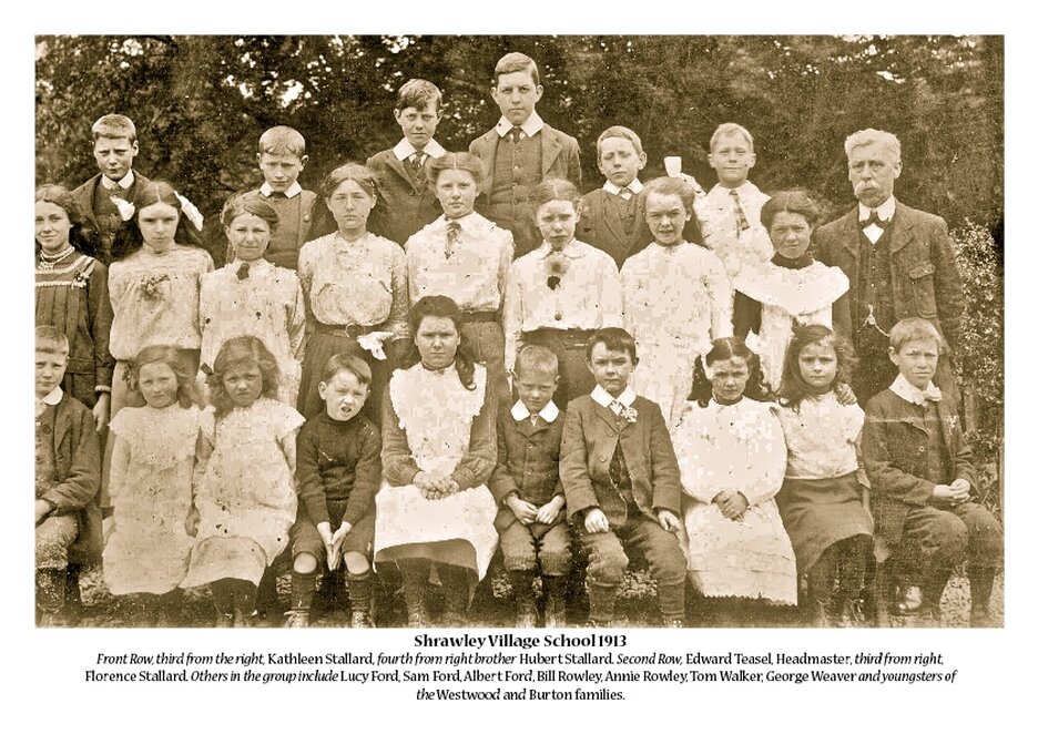 1906 The caption reads ‘Shrawley Group 1’ and shows the infants with their teacher Miss Maller